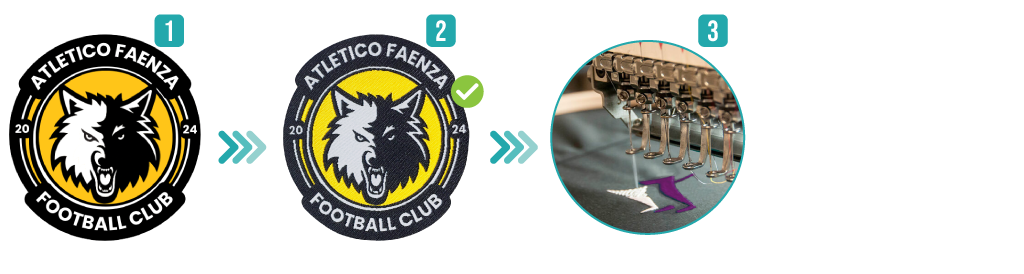 Grafische Dateien, die keine Anpassungen benötigen, werden direkt verarbeitet, um das "Modell" zu erstellen, also die digitale Reproduktion der Patch, und gehen direkt ins Labor zur Endproduktion. Dies ist natürlich die beste und schnellste Lösung, die eine Patch ermöglicht, die dem Originaldesign treu bleibt, ohne grafische Bearbeitungen.